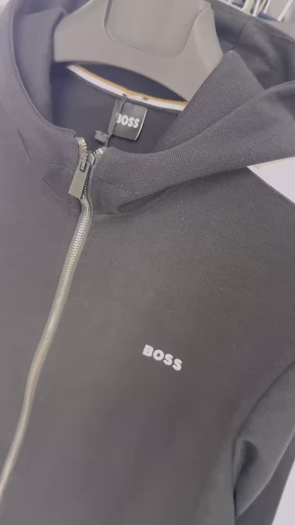 Trening bărbătesc BOSS, ecru cu dungi negre.